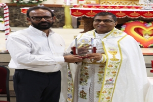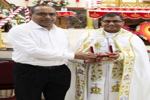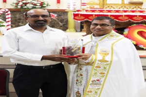 One of the previous trustees, Mr.Joshy Joseph, receiving the plaque from the vicar Rev.Fr.George Elambasseril, for his altruistic services to the church during 2022 - 2025.